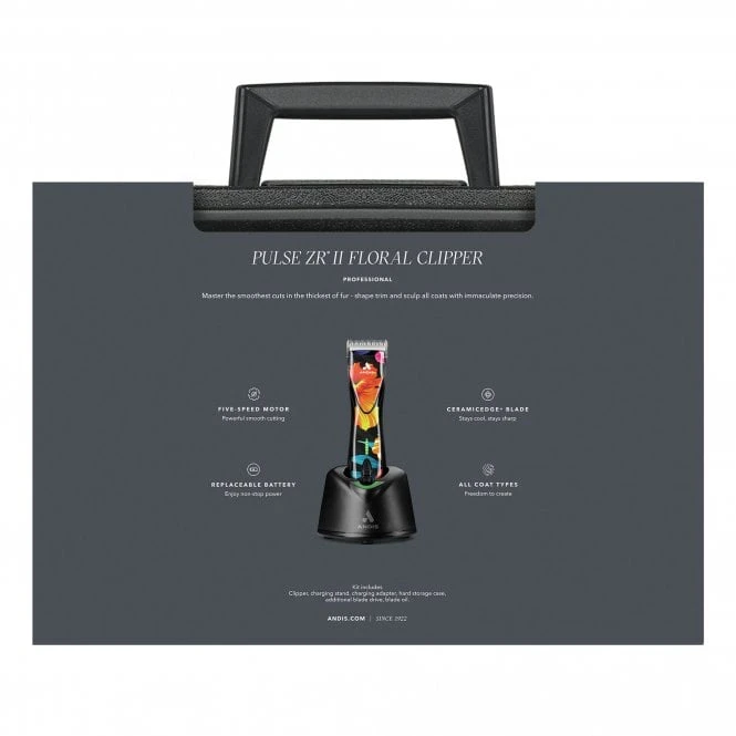 Andis has supplied the ultimate clipper in the Pulse ZR II Cordless Limited Edition Flora, with its powerful 5-speed rotary motor which runs ultra-quiet. This versatile clipper is just the thing for groomers working on a range of coat types, helping to cut through dense hair as well as fine hair.