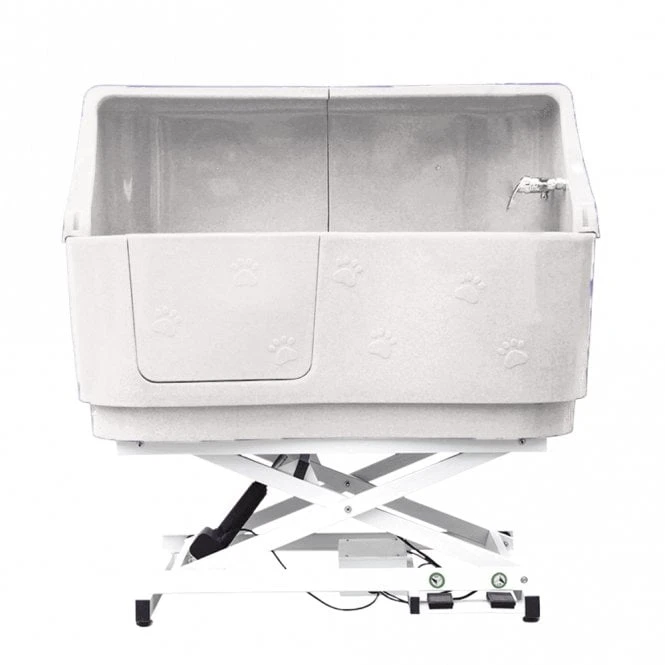 This extremely stable and strong electric bath is perfectly suited to a busy salon that caters to most breeds. It features a foot pedal-controlled adjustable chassis which allows the height to be altered to a comfortable working height. This also allows for medium sized and older dogs to be able to step into the bath. This bath features a sliding door to make accessing the bath easy, and a half-length removable platform inside the bath so that you can reach smaller dogs with ease. The full internal depth of the tub is 50cm, making the bath suitable for larger dog breeds. The base of the bath is also patterned to provide an easy non-slip grip for the pet. This attractively designed bath features four spaces for shampoo and decorative moulded paw prints to the front.
