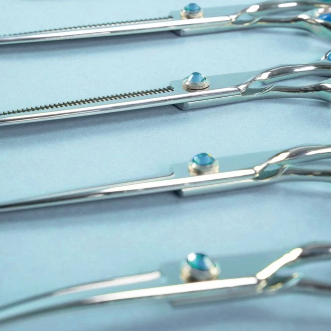 The Topaz range is a beautifully made collection of blue gemmed scissors, crafted from high quality, sturdy stainless steel that offers precision and excellent performance. Ideal for professional groomers wanting to add some class and dynamism to their scissor collection, these scissors are designed to last and work beautifully through heavy-duty cutting and professional everyday use.