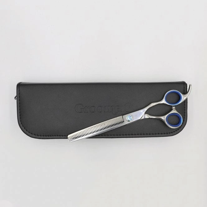 Groomers Topaz 7″ 50T Thinning Scissors are great for thinning the coat, and softening harsh scissoring and clipper lines. Featuring 50 teeth on one edge, for effortless thinning, and a smooth edge on the other, for a clean, snag free groom. Removing more hair quicker when compared with our blenders, these scissors create a natural look and remove bulk, leaving a smooth finish on the coat.