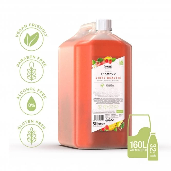 Wahl Dirty Beastie shampoo is perfect for very thick, smelly, matted coats to thoroughly cleanse and effectively deodorise. The shampoo contains natural ingredients, including extracts of peach, pear, passion-flower and kiwi fruit to give a fresh, fruity, long-lasting scent that helps to eliminate all odour.