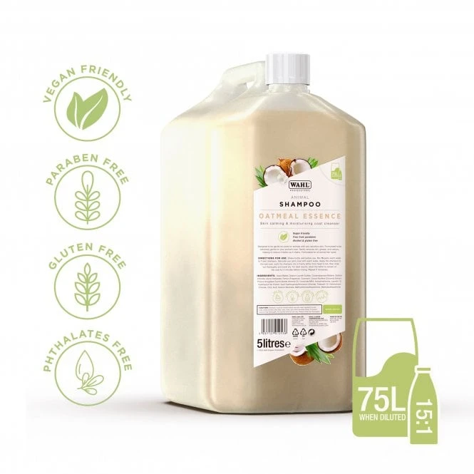 Wahl Oatmeal Essence Shampoo is the perfect shampoo for dogs with very sensitive skin. It contains oat proteins to soothe and reduce irritation in the skin, as well as natural coconut extract and almond oil to help moisturise skin and condition hair, helping to ease dryness and inflammation at the same time. This gentle shampoo removes dirt, grease and odour from the coat and is suitable for all hair types. With a soft and natural smelling coconut fragrance with a hint of sweetness.